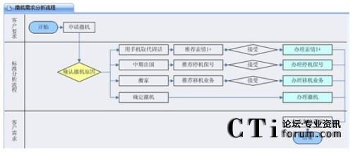 客戶呼入之后,座席人員要做的第一件事情就在IT系統(tǒng)的支持下先去捕獲客戶訴求,不用擔心座席會混淆相似的業(yè)務(wù)類型,因為呼叫中心針對典型的業(yè)務(wù)訴求會做出非常詳盡的引導(dǎo)流程,相似的或者關(guān)聯(lián)的業(yè)務(wù)類型在此流程中會體現(xiàn)出來,座席人員可以點擊,快捷地出入于各業(yè)務(wù)類型的引導(dǎo)圖,通過比較、判斷,最終定位出客戶真正訴求。例如下文客戶呼入本來想做“撤機”業(yè)務(wù),通過業(yè)務(wù)引導(dǎo)圖,最終定位到了客戶的真正訴求,辦理了停機保號業(yè)務(wù)或者移機業(yè)務(wù)。