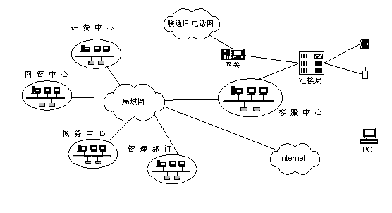 聯(lián)通北京分公司將客戶服務(wù)系統(tǒng)與現(xiàn)有計(jì)費(fèi)、營(yíng)業(yè)、帳務(wù)系統(tǒng)進(jìn)行組織,形成了一個(gè)有機(jī)的結(jié)合體,能夠充分發(fā)揮出現(xiàn)有系統(tǒng)的優(yōu)勢(shì)。客戶服務(wù)系統(tǒng)從營(yíng)業(yè)帳務(wù)系統(tǒng)提取相關(guān)用戶資料,建立客戶服務(wù)的系統(tǒng)資料庫(kù),從計(jì)費(fèi)系統(tǒng)提取相關(guān)用戶話費(fèi)資料等供查詢使用。同時(shí)客服系統(tǒng)還將與北京聯(lián)通現(xiàn)有的計(jì)費(fèi)、營(yíng)業(yè)、帳務(wù)、網(wǎng)管等相關(guān)系統(tǒng)以及Internet相連,提供業(yè)務(wù)處理和用戶自助服務(wù)等業(yè)務(wù)。本客服中心通過2對(duì)路由器和DDN專線與聯(lián)通北京分公司現(xiàn)有的局域網(wǎng)(包括管理部門、網(wǎng)管中心、計(jì)費(fèi)中心、帳務(wù)中心等相關(guān)系統(tǒng))連接,并通過該局域網(wǎng)訪問Internet。