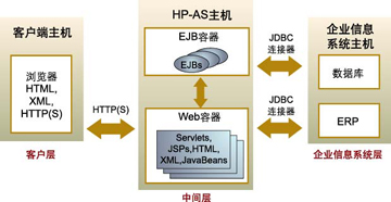 在一個(gè)開發(fā)環(huán)境中把上述3層一般都安裝在同一臺計(jì)算機(jī)上,以便模擬3層環(huán)境。這樣,開發(fā)者在實(shí)際環(huán)境開發(fā)應(yīng)用之前,可以快速開發(fā)和測試應(yīng)用?墒牵趯(shí)際環(huán)境中,各個(gè)層一般位于不同的計(jì)算機(jī)上。圖2表示了HP-AS是如何采用J2EE技術(shù)實(shí)現(xiàn)分布式應(yīng)用的。