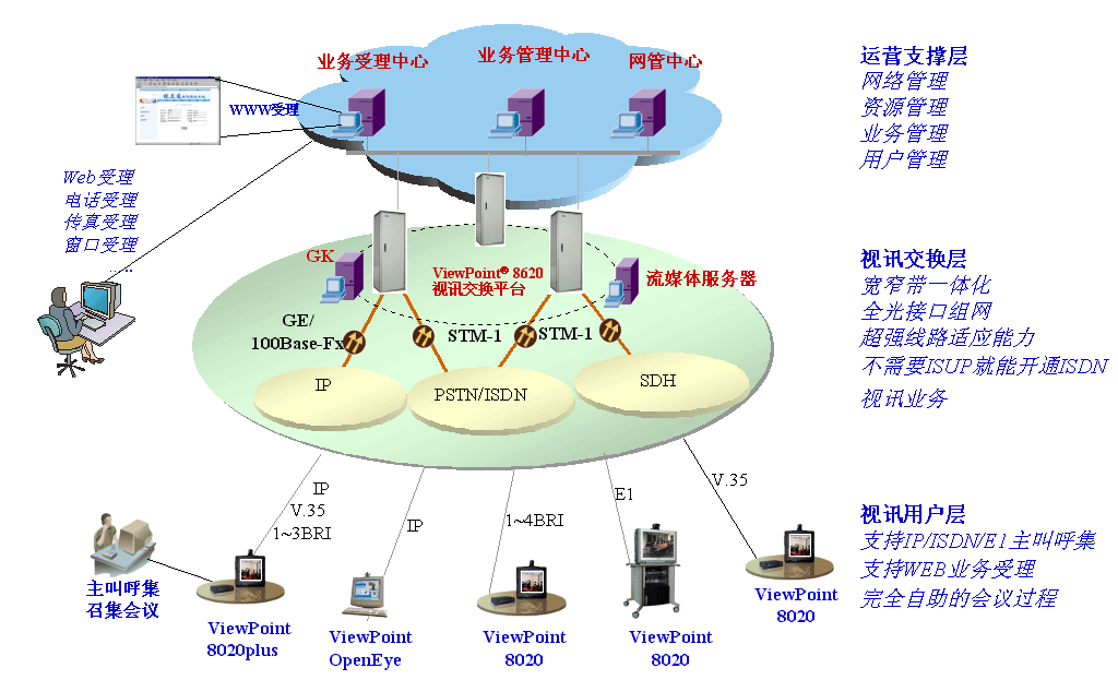 面對公眾視訊業(yè)務發(fā)展的契機,由于基于窄帶H.320的視訊系統(tǒng)較為成熟,而基于IP網(wǎng)的H.323系統(tǒng)被普遍看好,ISDN目前是最方便的公眾視訊系統(tǒng)接入手段,相對于其他接入方式(如E1、DDN、FR、ATM、IP等)使用方便,可方便通過撥號方式與任何聯(lián)網(wǎng)地區(qū)建立會議。ViewPoint 8620視訊交換平臺采用寬窄帶一體化設(shè)計,可為各行各業(yè)用戶提供完備的一體化解決方案,不僅能提供大容量ISDN用戶撥號接入,還能提供大容量的E1/V.35/IP方式接入。公眾視訊業(yè)務的發(fā)展,將視訊業(yè)務從單純?yōu)樯贁?shù)特定用戶群提供遠程會議服務,轉(zhuǎn)而面向公眾,為各行各業(yè)提供視訊業(yè)務。