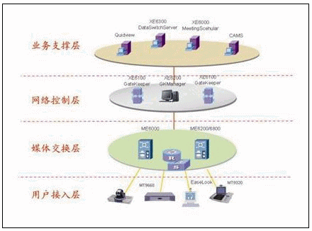 VV-SYS的業(yè)務(wù)支撐層大大增強了視訊系統(tǒng)的交互性和智能性,業(yè)務(wù)支撐層包括Quidway XE6000 MeetingScheduler會議調(diào)度系統(tǒng)、XE6300