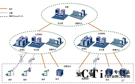 石油行業(yè)客戶根據(jù)行業(yè)特點和組織結(jié)構(gòu),其內(nèi)部通訊辦公網(wǎng)絡(luò)的拓撲結(jié)構(gòu)大致如下: