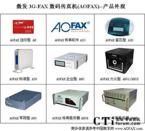 AOFAX系列電腦傳真產(chǎn)品擁有最齊全的型號(hào),包括免費(fèi)使用的AOFAX傳真軟件A10、SOHO/商旅人士便攜使用的AOFAX迷你型數(shù)碼傳真機(jī)A8、單電腦使用的AOFAX普及型數(shù)碼傳真機(jī)A20、4用戶環(huán)境的AOFAX標(biāo)準(zhǔn)型電子傳真機(jī)A30、軍警使用的AOFAX軍用型傳真系統(tǒng)A50、公安專用傳真服務(wù)器A51、營運(yùn)版網(wǎng)絡(luò)傳真服務(wù)期A52、不限用戶數(shù)目的AOFAX企業(yè)型網(wǎng)絡(luò)傳真機(jī)A60、1至2線的AOFAX大眾型傳真服務(wù)器A801和A802,2至256傳真線路多種規(guī)格的AOFAX專業(yè)型傳真服務(wù)器A80X、跨區(qū)域大型公司使用的集團(tuán)傳真系統(tǒng)和行業(yè)解決方案等,價(jià)格從幾百到幾十萬元,可適應(yīng)各類型客戶的需求,以下為AOFAX全系列產(chǎn)品外觀圖。