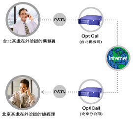 有了AltiGen提供的網(wǎng)路電話閘道器,跨國公司的臺北業(yè)務(wù)員只要花市內(nèi)電話的費(fèi)用,就可以跟北京出差的總經(jīng)理共商要事,節(jié)省的70 %以上的國際電話費(fèi)用。通訊流程如下: