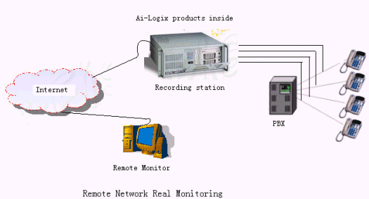 如上圖,在Recording Station 中裝有支持MVIP總線的Ai-Logix系列錄音卡.Recording Station通過Ai-Logix系列錄音卡搭線在被監(jiān)聽的電話線上,采用高阻錄音技術(shù),取得通話的錄音數(shù)據(jù),再由Internet實(shí)時傳給Remote