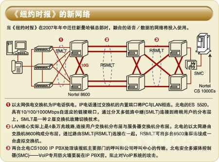 在離開(kāi)自1913年就堆滿紙張的43號(hào)大街總部的同時(shí),《紐約時(shí)報(bào)》也將離開(kāi)基于Avaya專(zhuān)用分組交換機(jī)和電話,以及Cisco交換機(jī)和路由器的傳統(tǒng)語(yǔ)音/數(shù)據(jù)網(wǎng)。新辦公大樓中的網(wǎng)絡(luò)從局域網(wǎng)到數(shù)據(jù)中心及內(nèi)網(wǎng)核心均采用北電的設(shè)備!都~約時(shí)報(bào)》IT技術(shù)人員表示,由單廠商組建的網(wǎng)絡(luò)將為用戶提供更高的安全性、更容易的管理和更豐富的媒體功能。