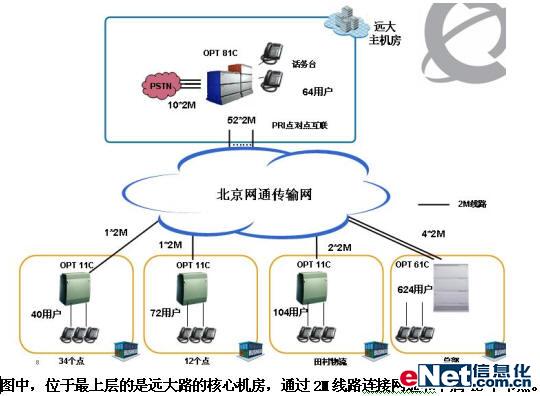 新的網(wǎng)絡建成以遠大路中心機房為核心的星形網(wǎng)絡,租用北京網(wǎng)通2M專線的方式同各個門市店連接。各個門市店設立了自己的程控交換機,并通過E1中繼方式和核心機房實現(xiàn)全網(wǎng)互聯(lián)。在此方案中,所有的市話呼入和呼出都通過核心節(jié)點同網(wǎng)通之間的中繼通道,從而實現(xiàn)大中電器內(nèi)部話音通訊的統(tǒng)一編號方案、統(tǒng)一撥號規(guī)則、統(tǒng)一維護和管理;并對外公布公開和便于記憶的號碼,以配合網(wǎng)點的促銷活動,以及未來客戶服務等應用的擴展。