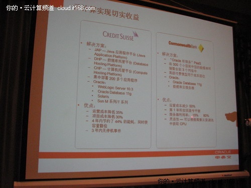 還有一個(gè)客戶(hù)是澳大利亞聯(lián)邦銀行(Commonwealth Bank)。該公司選用Oracle Database 11g和Oracle數(shù)據(jù)庫(kù)云服務(wù)器,開(kāi)發(fā)了一個(gè)名為“Oracle即服務(wù)”的PaaS,將300個(gè)中小型數(shù)據(jù)庫(kù)環(huán)境整合到3個(gè)網(wǎng)格中。目前該銀行運(yùn)營(yíng)成本減少50%,根據(jù)需要就可從資源池中獲取CPU,實(shí)現(xiàn)了靈活性, 在第1年即實(shí)現(xiàn)盈虧平衡。