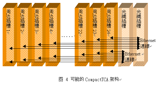 3.0)所定義的系統(tǒng)管理能力、PICMG 2.0所定義的標準機箱(Form Factor)及PICMG 2.16所定義的數(shù)據(jù)傳輸。這種架構(gòu)將不包含PCI總線,在此架構(gòu)下的系統(tǒng)將能夠支持24個外圍插槽與2個光纖插槽。摒除PCI總線將可降低CompactPCI