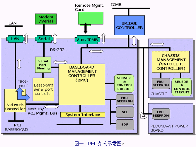 由圖二我們可以看出,IPMI的界面以及上層的管理都需求一些軟件來支持,以下將簡略的描述IPMI所涉及到的軟硬件種類: