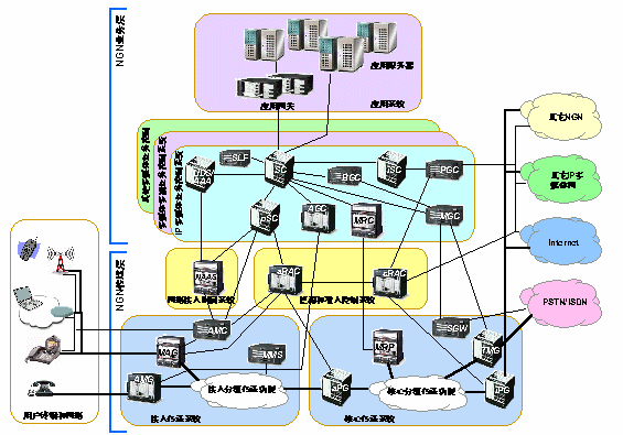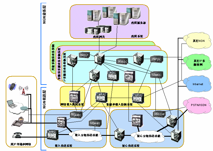 NGN是基于分組技術(shù)和多層網(wǎng)絡(luò)結(jié)構(gòu)的未來電信網(wǎng)絡(luò)。它可支持所有可能的業(yè)務(wù),包括使用各種媒體類型和轉(zhuǎn)播方式的、具有不同性能要求的業(yè)務(wù)。它的業(yè)務(wù)與傳送分離、控制與用戶數(shù)據(jù)處理分離的構(gòu)架允許網(wǎng)絡(luò)中各個部件可分別配備和獨立發(fā)展。業(yè)務(wù)的提供采用具有開放接口的業(yè)務(wù)平臺,可以為第三方業(yè)務(wù)提供者所使用。傳送層采用可支持不同帶寬和端到端QoS能力的技術(shù)。NGN控制功能可分布于現(xiàn)有和新的網(wǎng)絡(luò)基礎(chǔ)設(shè)施上并可按組網(wǎng)的要求采用不同的組合形式。網(wǎng)關(guān)提供NGN不同域之間或NGN和現(xiàn)有網(wǎng)絡(luò)之間的互通。NGN支持通用移動性,使用戶或其他移動體無論其位置或技術(shù)環(huán)境的變化都能進行通信和接入業(yè)務(wù)。它允許用戶可以跨越不同的有線或無線接入技術(shù),跨越現(xiàn)有網(wǎng)絡(luò)的界限使用他們的業(yè)務(wù)。| AGC Access Gateway Controller AMC Access Management Controller AMG Access Media Gateway AS Application Server BGC Breakout Gateway Controller MAG Multimedia Access Gateway MGC Media Gateway Control Function MGW Media Gateway MMS Mobility Management Subsystem MRC Multimedia Resource Controller MRP Multimedia Resource Processor NAAS Network Access Attachment Subsystem |