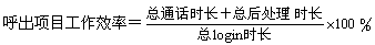 - 定義:呼出項(xiàng)目的工作效率是衡量呼出項(xiàng)目座席工作負(fù)荷率的主要KPI,一般指某段統(tǒng)計(jì)時(shí)間內(nèi),總處理時(shí)長(zhǎng)與登錄系統(tǒng)時(shí)長(zhǎng)的比率。對(duì)于沒有座席操作系統(tǒng)的呼叫中心可以將分母換成計(jì)劃工作時(shí)長(zhǎng)。