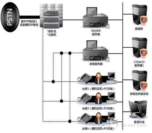交換機(jī)方案是以電話交換為基礎(chǔ)搭建的呼叫中心,集成了PBX交換機(jī),IVR語音導(dǎo)航,ACD智能排隊(duì),CTI電腦系統(tǒng)管理,錄音與管理。系統(tǒng)處理能力在1000個坐席以上,系統(tǒng)可能性搞,支持分布式坐席。