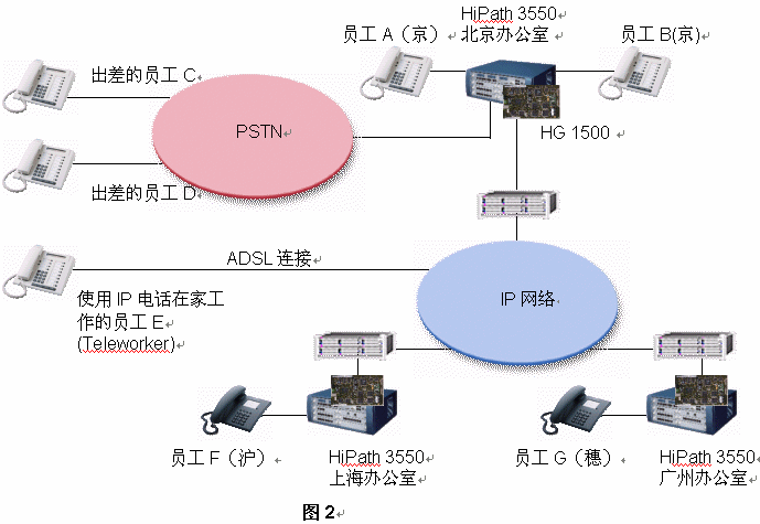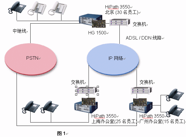 西門子推薦該公司每一個(gè)辦公室均采用HiPath 3550 PBX。如果,A公司每個(gè)辦公室已經(jīng)擁有DDN專線或ADSL連接至Internet,它就能將其內(nèi)部通信建設(shè)在現(xiàn)存的IP網(wǎng)絡(luò)的基礎(chǔ)之上。其集成網(wǎng)關(guān)HiPath 1500被用來連接數(shù)據(jù)網(wǎng)絡(luò)和語音網(wǎng)絡(luò)。在這樣的網(wǎng)絡(luò)架構(gòu)中,路由冗余能夠得到充足的保證,因?yàn)槲鏖T子HiPath解決方案提供了最大的網(wǎng)絡(luò)存活性:即使IP網(wǎng)絡(luò)出現(xiàn)故障,西門子網(wǎng)絡(luò)設(shè)置能夠?qū)⒙酚勺詣忧袚Q至PSTN之上。