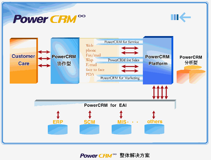 創(chuàng)智集團(tuán)投入巨資,推出的PowerCRM是一套完全基于WEB方案的企業(yè)級(jí)的客戶關(guān)系管理應(yīng)用系統(tǒng)。是中國(guó)第一款自主開(kāi)發(fā)的具有大容量數(shù)據(jù)處理能力,具有大型系統(tǒng)定制能力,針對(duì)中高端用戶、大型企業(yè)(通信行業(yè)、金融、證券、保險(xiǎn)行業(yè)、制造業(yè)、零售業(yè)、服務(wù)行業(yè)、顧問(wèn)咨詢行業(yè)、IT行業(yè)等)解決方案,是國(guó)家計(jì)委高技術(shù)產(chǎn)業(yè)化示范工程。盡管已有不少國(guó)內(nèi)軟件廠商紛紛推出自己的CRM,但僅停留在“入門(mén)級(jí)”水平,只能為中小企業(yè)提供傳統(tǒng)的、以運(yùn)營(yíng)型為主的CRM解決方案,雖然也可以幫助企業(yè)用戶處理好客戶關(guān)系,提高工作效率,但難以帶來(lái)贏利。PowerCRM將自己主要的競(jìng)爭(zhēng)對(duì)手定位于Siebel, Oracle等知名的國(guó)際級(jí)公司的產(chǎn)品。同過(guò)不斷地優(yōu)化產(chǎn)品設(shè)計(jì),爭(zhēng)取奉獻(xiàn)給國(guó)內(nèi)企業(yè)客戶功能最強(qiáng)大,性能價(jià)格比最高,最符合中國(guó)企業(yè)特色的CRM產(chǎn)品。