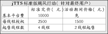 jTTS標(biāo)準(zhǔn)版在聲音質(zhì)量、聲音平滑度、自然度等方面已具有比較高的實(shí)用化水平。為了真正啟動語音技術(shù)的應(yīng)用市場,捷通華聲啟動“颶風(fēng)行動”,在活動期間為最終客戶、系統(tǒng)集成商制定了一個極具競爭力的價格,并且無平臺費(fèi)。這次活動主要針對CTI領(lǐng)域中大量中小型系統(tǒng)的應(yīng)用開展此次活動,目的是讓先進(jìn)的技術(shù)能夠被更多的用戶采用,為系統(tǒng)集成商應(yīng)用TTS技術(shù)提供了很高的利潤空間。
