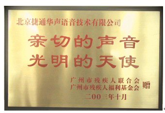 近日,廣州殘疾人聯(lián)合會授予了北京捷通華聲語音技術(shù)有限公司"親切的聲音,光明的天使"榮譽(yù)稱號,并頒發(fā)了金匾和榮譽(yù)證書,感謝捷通華聲為廣州的社會福利事業(yè)的近10萬元的捐獻(xiàn)與長期的技術(shù)支持。