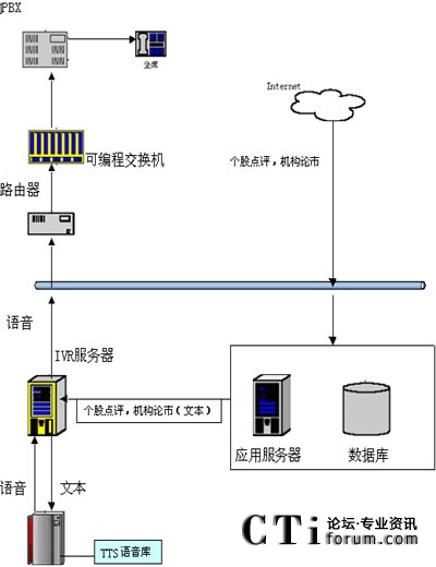 技術實現(xiàn)上,證券交易所可從網(wǎng)上下載個股點評信息或熱門個股信息,之后將這些信息的文本傳遞給IVR服務器,IVR會通過調(diào)用TTS服務器得到這些信息的語音流,之后就可以在坐席上播放這些信息的語音了。如圖所示: