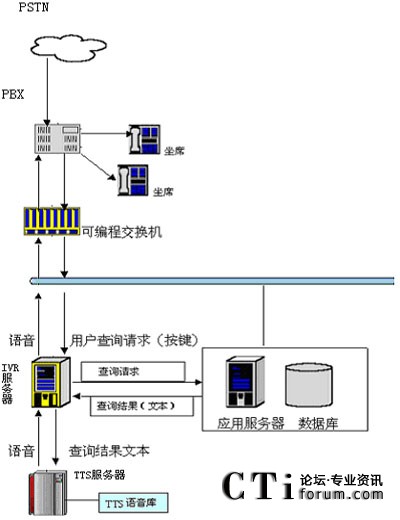 在技術上,用戶可以通過電話提交他的查詢請求(比如使用按鍵方式),IVR服務器收到請求后會向其他應用服務器提交此查詢請求,當IVR得到查詢結(jié)果后,他會將文本形式的查詢結(jié)果交給jTTS服務器,jTTS服務器會返回查詢結(jié)果的語音形式,最終語音會在坐席上播放,用戶就可以聽到他剛才所要查詢的信息。(如圖所示)