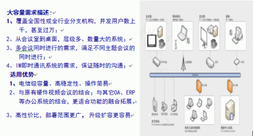 太平洋保險(xiǎn)集團(tuán)下根據(jù)業(yè)務(wù)模式劃分為產(chǎn)險(xiǎn)、壽險(xiǎn)2個(gè)公司,每個(gè)公司在全國(guó)各省都有分公司,目前集團(tuán)公司管理著主服務(wù)器,每個(gè)分公司都有自己的從服務(wù)器,總計(jì)60余臺(tái)從服務(wù)器,應(yīng)用的交互點(diǎn)數(shù)1000點(diǎn),旁聽點(diǎn)數(shù)300點(diǎn)。保險(xiǎn)行業(yè)銷售人員流動(dòng)快、各種培訓(xùn)頻繁、新險(xiǎn)種推出層出不窮,其中省分公司、眾多支公司與銷售網(wǎng)點(diǎn)人員的即時(shí)音視頻交流是重中之重,為了滿足客戶要求系統(tǒng)平臺(tái)支持大容量會(huì)議人數(shù)、多會(huì)議同時(shí)召開以及流暢的音視頻交換的要求,國(guó)際視訊知名廠商北京威速科技有限公司專門為大企業(yè)級(jí)用戶開發(fā)出了高性能大容量的視頻會(huì)議產(chǎn)品。這種更適用組織機(jī)構(gòu)龐大、更穩(wěn)定的純軟件網(wǎng)絡(luò)視頻會(huì)議平臺(tái),是迄今為止業(yè)內(nèi)唯一勝任單會(huì)議室同時(shí)容納千人以上用戶開會(huì),并支持無(wú)限量會(huì)議室,并且通過級(jí)聯(lián)技術(shù)可以同時(shí)支持幾千路音視頻交互并發(fā),同時(shí)實(shí)現(xiàn)一個(gè)集視頻交互、音頻交互、屏幕廣播、遠(yuǎn)程控制、文字交流、電子白板、文檔共享、文件傳輸?shù)榷囗?xiàng)功能于一體的綜合多媒體遠(yuǎn)程會(huì)議平臺(tái)。自V2 conference應(yīng)用以來(lái),承擔(dān)了公司絕大部分遠(yuǎn)程交流任務(wù),太平洋保險(xiǎn)集團(tuán)已把視頻會(huì)議交流當(dāng)作工作的一部分,成為工作之必須的習(xí)慣。極大地提高了企業(yè)運(yùn)作效率、降低了成本,而這些正是金融保險(xiǎn)機(jī)構(gòu)的制勝之道。