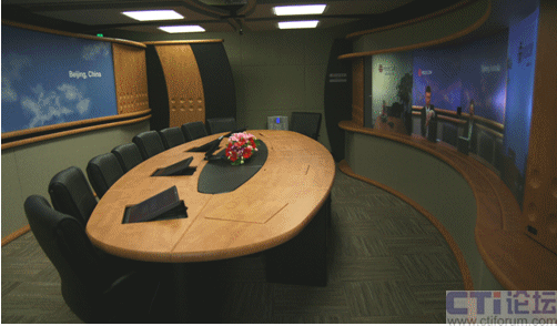 雖然對(duì)“極致遠(yuǎn)真”早有耳聞,但踏入體驗(yàn)室的那一刻,眼前的一切還是超出了我的想象:與眾不同的寬銀幕全景顯示屏呈現(xiàn)獨(dú)特的弧形設(shè)計(jì),感覺(jué)像是進(jìn)入了環(huán)形電影院,處于關(guān)閉狀態(tài)的大屏幕巧妙的鑲嵌在墻壁上,一張能容納16個(gè)人同時(shí)開(kāi)會(huì)的大型會(huì)議桌占據(jù)了會(huì)議室的中心部位。此外,室內(nèi)的桌椅、墻壁、天花板等整套家具都是經(jīng)過(guò)精心裝飾的,這時(shí)的體驗(yàn)中心更像一間豪華的商務(wù)會(huì)議室。