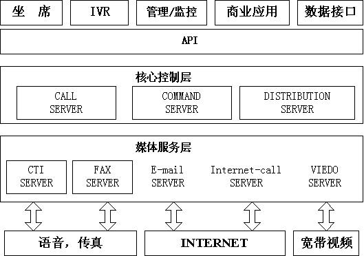 需要指出的是,由于ICSYS智能平臺(tái)系統(tǒng)采用了媒體服務(wù)層,上述所有Internet 呼叫事件都統(tǒng)一發(fā)送到系統(tǒng)核心層,所有呼叫的路由都由核心層Distribution Server來統(tǒng)一分配,從而保證了多種媒體的統(tǒng)一接入和統(tǒng)一排隊(duì)。三 商業(yè)應(yīng)用