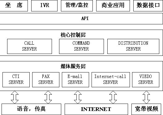 核心控制層用于對來自不同媒介的客戶進行識別和路由,幫助企業(yè)最大限度地對每個連接加以利用,實現(xiàn)對所有客戶的全面交互管理,能夠對進入呼叫中心的語音呼叫、電子郵件、Web聯(lián)系和傳真通信等所有類型的多媒體交互進行路由、通告和告警?梢詫Σ煌挠脩、不同的聯(lián)系方式進行統(tǒng)一調(diào)度和個性化處理,并集中進行管理、定制和用戶來訪信息的記錄。