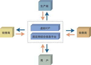讓我們看看這樣一個(gè)應(yīng)用,以固定網(wǎng)綜合信息平臺(tái)為基本支撐平臺(tái),以“虛擬ICP”為業(yè)務(wù)承載平臺(tái),包含了銷(xiāo)售商、生產(chǎn)商、供應(yīng)商、消費(fèi)用戶(hù),形成了一個(gè)初步完整供應(yīng)鏈系統(tǒng),如圖所示。