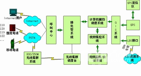 本系統(tǒng)實(shí)現(xiàn)接警、處警功能。接警中心統(tǒng)一接聽和處理市民的報警、求助電話,市民可以通過電話撥打110、119、120、122等緊急特服號碼或只撥打統(tǒng)一的特服號碼(或通過Internet方式)向系統(tǒng)求助;處警中心接收接警中心轉(zhuǎn)發(fā)的警情數(shù)據(jù),并借助地理信息系統(tǒng)的定位、空間分析功能,對所有的資源和警力通過一體化的數(shù)據(jù)傳輸和通訊調(diào)度臺進(jìn)行方便的統(tǒng)一管理、指揮和調(diào)度。
