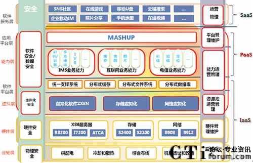 軟件服務層主要是對用戶提供具體的服務,比如SNS社區(qū)、移動U盤、企業(yè)移動IM等。同時,中興云計算架構(gòu)還提供多層次安全解決方案和管理方案。