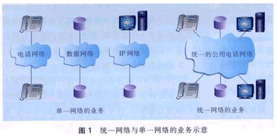 。1)數(shù)據(jù)和話音的融合進(jìn)一步促進(jìn)電話網(wǎng)絡(luò)、數(shù)據(jù)網(wǎng)絡(luò)與IP網(wǎng)絡(luò)的融合。一個(gè)統(tǒng)一的網(wǎng)絡(luò)提供各類(lèi)業(yè)務(wù)顯然比各類(lèi)網(wǎng)絡(luò)提供各自的業(yè)務(wù)要大大提高運(yùn)營(yíng)和服務(wù)的效率,如圖1所示。