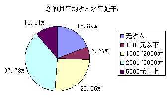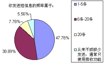 以上選擇中,選擇答案A~E的被訪者比例分別為18.89%、6.67%、25.56%、37.78%和11.11%,也就是說我們這次調(diào)查的重頭是放在一般收入水平和無收入(學(xué)生)兩類人群,這兩個(gè)人群也正是SMS市場(chǎng)上最活躍的分子。高收入和低收入人群要么因?yàn)橘Y金充裕而選擇語音業(yè)務(wù),要么就是因?yàn)橘Y金的缺乏而盡量不使用移動(dòng)通信方式。