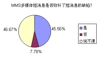 問卷的調(diào)查結(jié)果有些屬于意料之中,有些則暫一定程度上給運(yùn)營(yíng)商和終端提供上潑了冷水。不過,有一點(diǎn)是讓提供移動(dòng)服務(wù)的企業(yè)感到欣慰和滿意的,那就是:最終用戶對(duì)MMS的接受程度相當(dāng)高,除去對(duì)資費(fèi)、操作的質(zhì)疑外,幾乎90%以上的用戶都認(rèn)為MMS廣泛流行是一個(gè)必然的趨勢(shì)。下面我們就讀者們廣泛關(guān)注的問題來研究一下。
