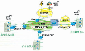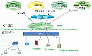 VPN中,實(shí)現(xiàn)業(yè)務(wù)在VLAN 和VPN中的無縫對(duì)接,以保證用戶數(shù)據(jù)的安全、高效傳輸;接入網(wǎng)采用基于RPR或SDH的MSPP環(huán)實(shí)現(xiàn)IP業(yè)務(wù)和TDM業(yè)務(wù)的綜合傳輸;在商業(yè)樓宇內(nèi)主要采用IAD設(shè)備將客戶的數(shù)據(jù)、語(yǔ)音、專線等業(yè)務(wù)接入CNC