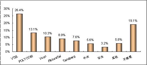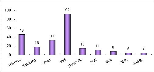各品牌的認知度與其市場銷售情況息息相關。例如,VTEL是最早進入中國市場的視頻會議廠商,并在相當長的時期內占據市場領先地位,取得顯著的品牌認知度是有其廣泛用戶基礎作為支撐的;POLYCOM雖然從1998年才開始進軍中國市場,但在基于IP的視頻會議系統(tǒng)的市場爭奪中取得較好的成績;PictureTel已經被POLYCOM收購,品牌認知度也相對較低;而國內品牌中興、華為剛剛起步,也很難達到較高的認知度。