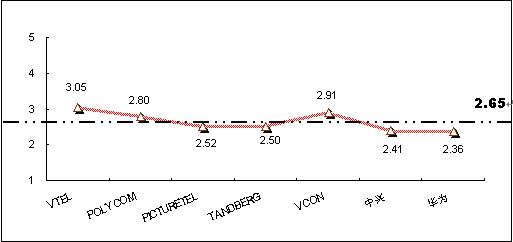 為深入了解和對比被調查者對不同品牌視頻會議終端系統(tǒng)產品的認知程度,本次調查將被調查者對各主要品牌的了解程度劃分為五個檔次,對不同的檔次賦予不同的分值,分別為“非常了解(5分)”、“了解(4分)”、“一般(3分)”、“不了解(2分)”、 “非常不了解(0分)”,同時綜合考慮以購買用戶擁有的品牌分布,借以比較不同品牌在認知度上的差異。統(tǒng)計結果顯示,目前在中國市場上,用戶對主要視頻會議終端系統(tǒng)產品品牌的了解程度的平均值為2.65,各品牌認知度分值見圖6。其中:VTEL品牌的知名度最高,指標值為3.05,超過了“一般”了解水平;其次為VCON品牌,指標值為2.91;POLYCOM的知名度指標值為2.8,處于第三位。除VTEL品牌外,其他主要品牌的知名度還都處于低于“一般”了解水平階段,反映出產品的市場認知還較低。