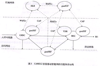 在移動通信領域,歐洲電信標準學會(ETSI)制定的CAMEL系列標準為基于GSM移動通信網絡的移動智能網提供了統(tǒng)一的規(guī)范。其中CAMEL2階段的標準符合ITU-T的IN CS-1,支持各種基于語音的智能業(yè)務。CAMEL2階段移動智能網的功能體系結構如圖1所示。CAMEL3階段的標準基于CS-2,主要增加了對GPRS移動數(shù)據(jù)業(yè)務以及短消息業(yè)務的支持。
