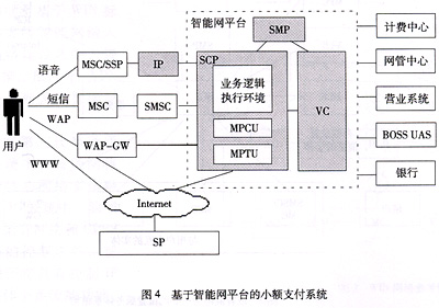 鑒于以上原因,目前中國移動正在建設的全國范圍的小額支付系統(tǒng)已確定采用基于智能網平臺的建設方式;谥悄芫W平臺的小額支付系統(tǒng)如圖4所示。