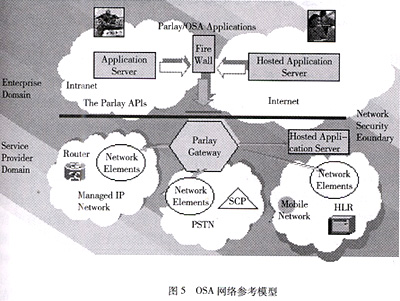 為了克服傳統(tǒng)智能網的上述不足,開放業(yè)務體系結構(OSA,Open Service Architecture)應運而生。如圖5所示,OSA是一種全新的業(yè)務體系結構,主要包括底層通信網絡,高層的應用服務器(Application Server),以及它們之間的開放接口。OSA繼承了智能網的思想精髓,高度抽象了底層網絡的能力,采用OSA/Parlay API編程接口,向第三方業(yè)務開發(fā)商開放,徹底屏蔽了底層網絡的復雜性。OSA/Parlay API已經被3GPP作為核心技術接受,并得到ETSI、JAIN、OMG等國際組織的承認。