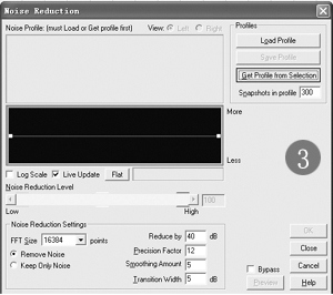 3.打開(kāi)左邊的Effects列表,展開(kāi)下面的Noise Reduction分欄并雙擊Noise Reduction,在彈出的對(duì)話框中點(diǎn)擊Get Profile from Selection按鈕,程序會(huì)讀入噪音樣本,之后關(guān)閉該對(duì)話框回到主界面,單擊噪音樣本音軌,按Delete刪除它,再雙擊另外一個(gè)波音音軌,進(jìn)入波音編輯器界面再雙擊,全選之后按照上面的操作再次打開(kāi)Noise Reduction對(duì)話框,按OK按鈕,程序便開(kāi)始去除噪音。