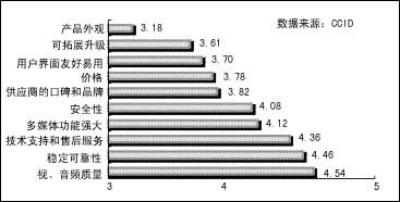 CCID對視頻會(huì)議現(xiàn)狀調(diào)查結(jié)果顯示,與以往相比,用戶對視頻會(huì)議終端系統(tǒng)的選擇標(biāo)準(zhǔn)已經(jīng)發(fā)生了變化。用戶除了一如既往地要求很好的音視頻質(zhì)量外,對產(chǎn)品的穩(wěn)定可靠性、技術(shù)支持和售后服務(wù)、多媒體功能、安全性四項(xiàng)也有要求。其中,用戶對視頻會(huì)議終端系統(tǒng)的多媒體功能和設(shè)備的可拓展升級提出了更高的要求,而不再局限于視音頻質(zhì)量和穩(wěn)定、可靠性上,對多媒體功能的需求在不斷地增長。更多的用戶不僅把會(huì)議系統(tǒng)用于視音頻開會(huì),更將視頻會(huì)議的多媒體功能作為采購的重要指標(biāo)之一。