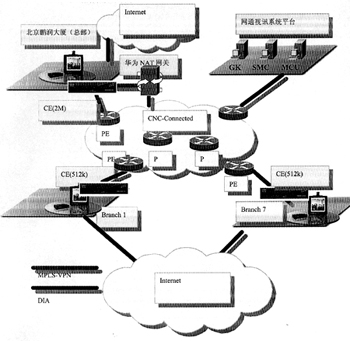 鑒于客戶是通信公司,有較強的系統(tǒng)管理能力,而且要求視訊和數(shù)據(jù)出口分開,視訊出口在北京,可以和VPN線路走相同的物理鏈路,不會造成路由設(shè)計上的問題,故將NAT放在客戶公司總部,由用戶自己管理,增加DIA出口和費用。網(wǎng)絡(luò)通信拓撲圖如右所示。