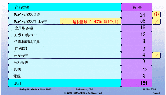 2003年5月底,世界上已經(jīng)有45個業(yè)務提供商正在使用Parlay 3.0或正準備采用Parlay技術。
