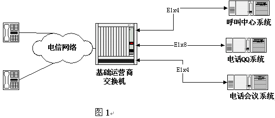 一種方式為固定分配, 即為每種語(yǔ)音系統(tǒng)分配固定數(shù)量的E1中繼,如圖1所示,這種方式的問題主要有兩個(gè)方面:一是中繼資源沒有充分共享使用,比如在晚上,可能電話QQ業(yè)務(wù)量很大而呼叫中心很小,而白天卻正好相反。如果為每一種業(yè)務(wù)都留有很大的中繼富裕又勢(shì)必導(dǎo)致中繼資源的浪費(fèi);二是當(dāng)中繼線路來(lái)源于多個(gè)運(yùn)營(yíng)商時(shí)存在連接上的困難。