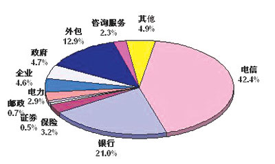 2004年中國呼叫中心席位總數(shù)為14萬個(gè),從不同行業(yè)呼叫中心席位數(shù)量看,電信行業(yè)占據(jù)60%以上的市場(chǎng)份額,制造企業(yè)占6.5%,政府占5.65%,銀行占5.58%。2004年中國呼叫中心投入205.0億元,從不同行業(yè)呼叫中心投入絕對(duì)值看,電信行業(yè)占據(jù)42.4%,銀行占21.0%,外包占12.9%,其他行業(yè)市場(chǎng)份額均低于5.0%。