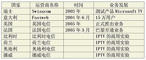 意大利FastWeb公司在歐洲IPTV發(fā)展中扮演了重要角色。其在IPTV經(jīng)營上的成功,改變了許多運營商原先對IPTV的觀望態(tài)度。目前,除意大利外,英國、法國、瑞典、德國、摩納哥、挪威、比利時、荷蘭、奧地利等國也開通了IPTV業(yè)務(wù),其IPTV運營商及業(yè)務(wù)推出時間詳見表5。