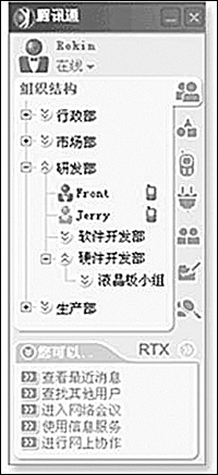 與其他應用程序集成是EIM的發(fā)展趨勢,也是企業(yè)現(xiàn)代辦公的一大需求。目前,騰訊通RTX已成功與國內著名的金碟、用友、北京慧點等軟件廠商開展合作,使騰訊通RTX的整體功能進一步提升,極大地方便了企業(yè)應用。比如通過與金碟OA的集成,實現(xiàn)了企業(yè)級實時通信平臺與企業(yè)管理軟件和信息化解決方案的緊密結合,從而更好地滿足客戶需求。通過與用友ERP集成,降低了企業(yè)通信時間和費用,提高了工作效率。