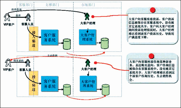 投訴的后臺處理流程分布在BOSS系統(tǒng)、1860客服中心、DSMP數(shù)據(jù)業(yè)務管理平臺以及OA多個業(yè)務支撐系統(tǒng)之中,系統(tǒng)之間相對獨立,同時投訴的交互數(shù)據(jù)分散在各個系統(tǒng)內(nèi),沒有一個完整、統(tǒng)一的客戶投訴資料,從而無法在不同的服務渠道中取得完整的客戶投訴信息,影響了客戶服務的質(zhì)量。當公司管理層需要了解某一項活動的開展情況或近期的投訴熱點、焦點問題時,操作人員只能采用傳真方式,臨時要求全省17地市、公司在一定時間內(nèi)上報,匯總后研究分析再行提交,使投訴熱點或焦點問題不能及時反饋給管理層。信息嚴重滯后,更談不上針對客戶投訴咨詢熱點問題進行數(shù)據(jù)挖掘,推出針對性的營銷策略。