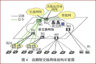 隨著PSTN用戶逐步轉(zhuǎn)變?yōu)檐浗粨Q網(wǎng)絡(luò)用戶,未來以軟交換網(wǎng)絡(luò)為核心、PSTN端局作為接入的網(wǎng)絡(luò)結(jié)構(gòu)將逐步形成。如圖4所示,軟交換網(wǎng)絡(luò)將覆蓋包括PSTN用戶在內(nèi)的各種類型的用戶終端,具有SSP功能,提供智能網(wǎng)業(yè)務(wù);具備大容量關(guān)口局功能,實(shí)現(xiàn)與其他運(yùn)營商網(wǎng)絡(luò)的互通。