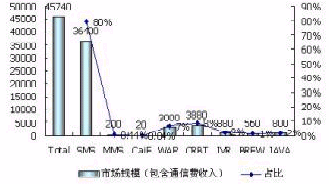 2005年包含運(yùn)營商通信費(fèi)收入在內(nèi)的中國移動(dòng)增值業(yè)務(wù)市場(chǎng)總規(guī)模為457.4億元,其中,包括SMS、CaiE、JAVA、BREW等在內(nèi)的移動(dòng)數(shù)據(jù)增值業(yè)務(wù)市場(chǎng)規(guī)模占到總體增值市場(chǎng)規(guī)模的90%,達(dá)到411.66億元;包括IVR,CRBT等在內(nèi)的移動(dòng)語音增值業(yè)務(wù)市場(chǎng)規(guī)模為57.4億元,占總體市場(chǎng)規(guī)模的10%。